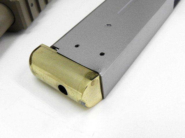 メタルチャンバーカバーが、KART.45NM刻印の物にカスタム。またアウターバレルもカ変更されているようです。マガジンが本体はシルバー、ゴールドのマガジンバンパーの物に変更。 (マガジン1部少し打痕が見られます)