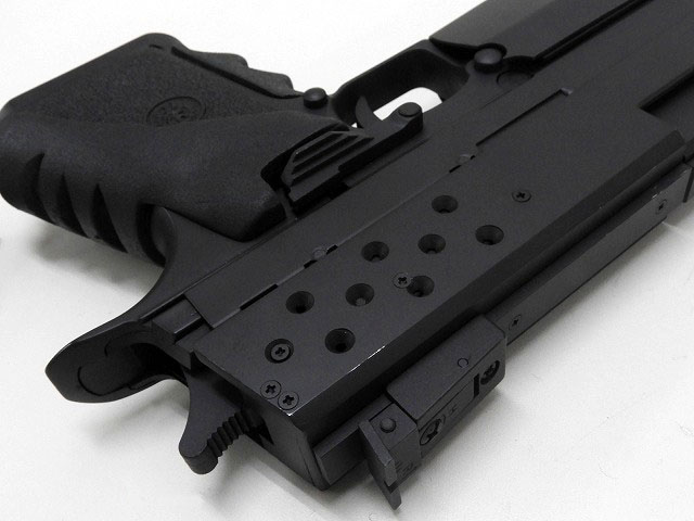 ハンドガンの場合は全体を金属性とする組み換え、エアソフトガンの場合は射出エネルギー0.98J以上にする改造を行うと銃刀法違反となります。HFC134a仕様のガスガンにCO2用マガジンを組み込む、スライドを金属製の物に差し替える等、簡易な改造でも罪に問われる可能性がございますので、絶対にお止めください。