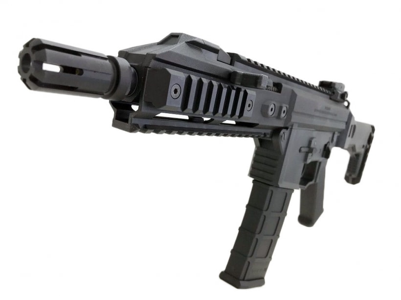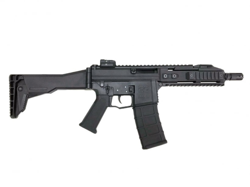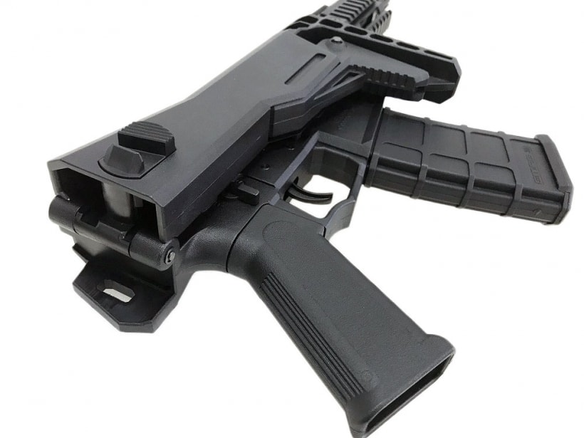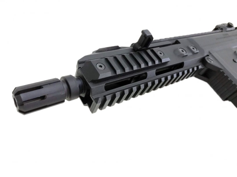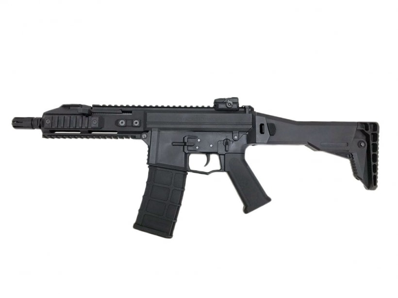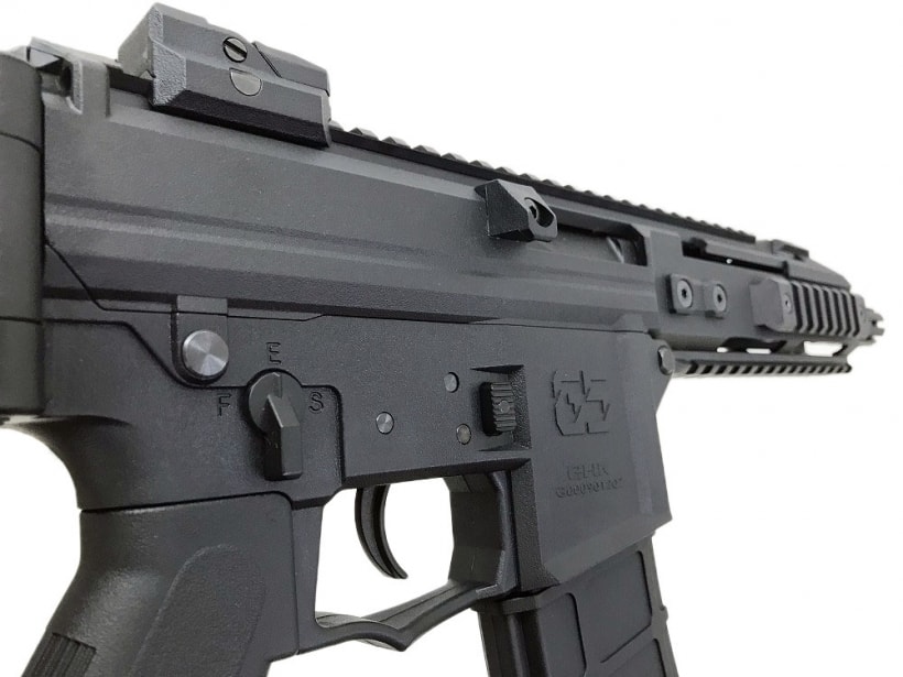 架空の銃ですがスタイリッシュなフォルムやトップ、サイドに設けられた20mmレール、 PDW並みのスマートな全長、フリップアップのアイアンサイト等、随所にユーザーの使い勝手を考えたアイデアが盛り込まれています。 本体には強化プラスチックを使用し、強度は充分。