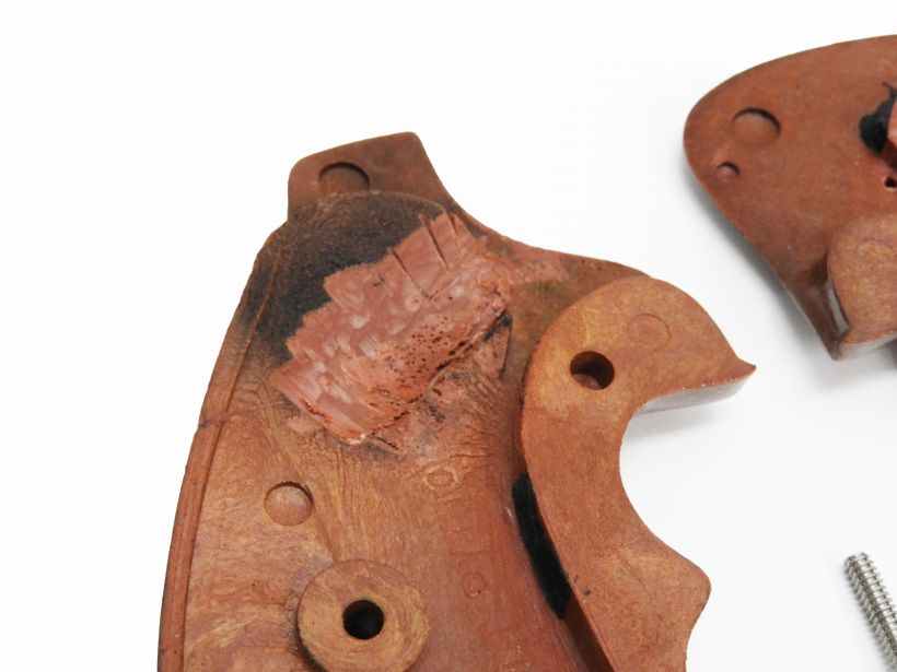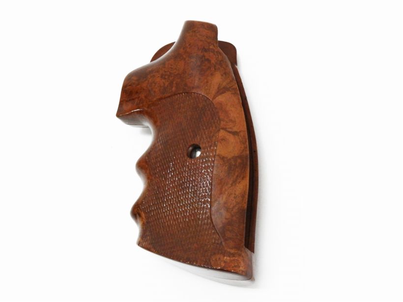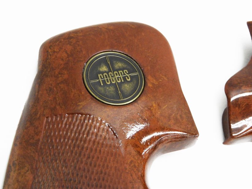 サファリランド傘下で実銃用の高品質なグリップを製造していたロジャース社のコルト・パイソン用グリップパネル。プラスチックのフェイクウッドとはいえ素材から作られた模様はまるでブライヤー材を思わせ、木材と同じようにニスで仕上げられている。