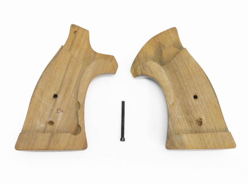 S&W Kフレーム用の木製グリップパネル。裏面にダボ穴を加工した跡があります。