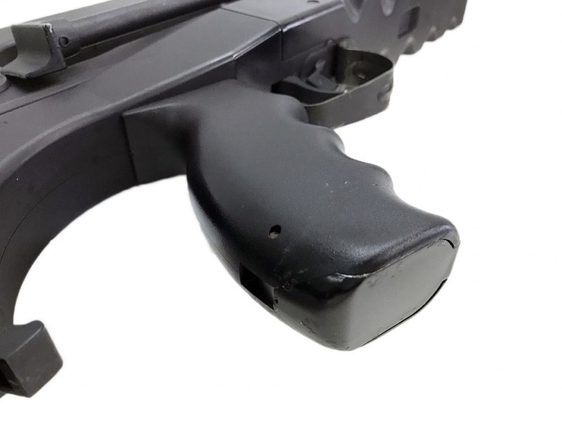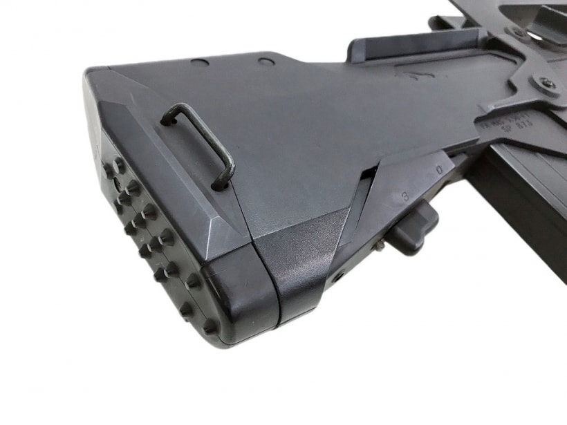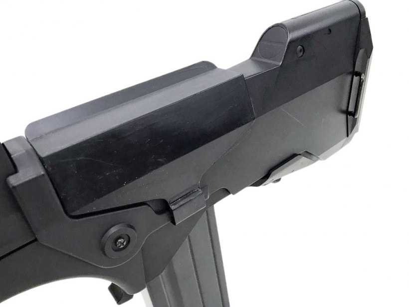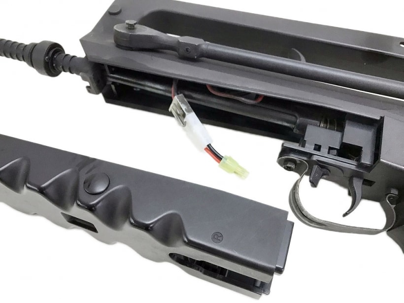 見た目はかなり大きな銃に見えるが全長は757mmとコンパクトなものだ。実銃ではM16のマガジンが共用できるようだが、残念ながらエアガンでは不可である。