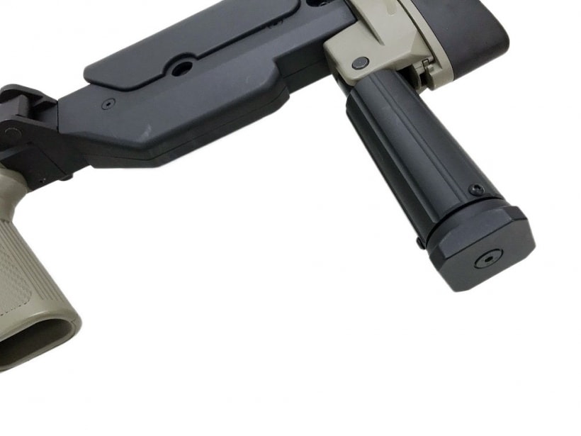 アルミ製、レイルはCNC切削出し。4面レイルが配されたハンドガード、チークライザー・バックストック・モノポッドグリップを備えたフォールディングストックなどを備え、機能性の高い仕上がり。