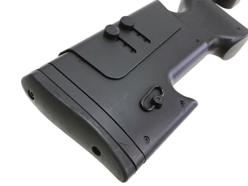 チークピースは手で調整可能なのでハイマウントのスコープにすぐに合わせられ、トックはパットを抜き差しで長さの調節が可能。