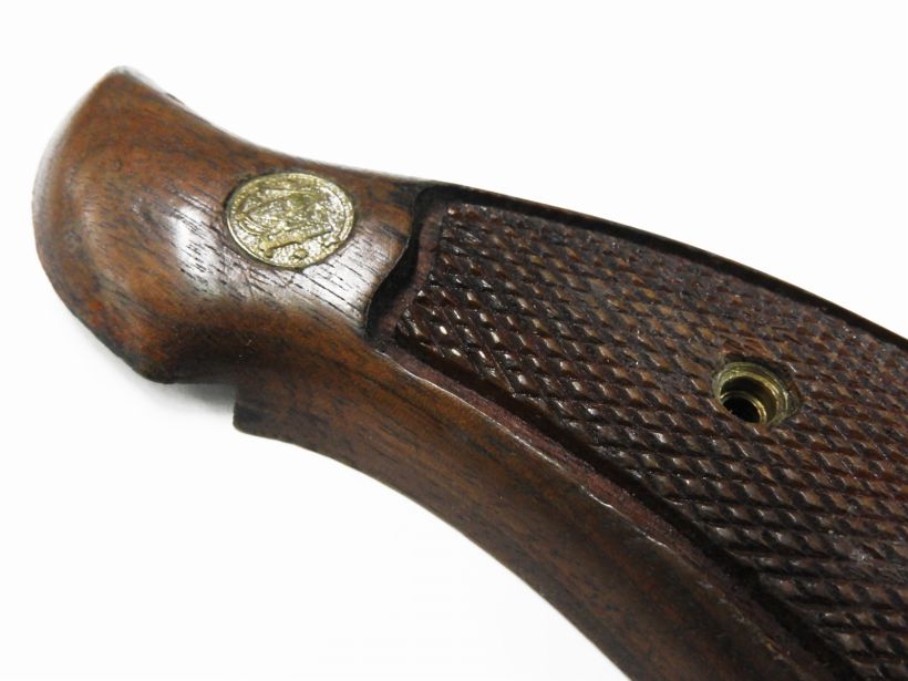 スミス&ウェッソン純正の実銃用グリップパネル。メダルのメッキが落ちて真鍮色になり全体に炭のような汚れが染み込んでいます。