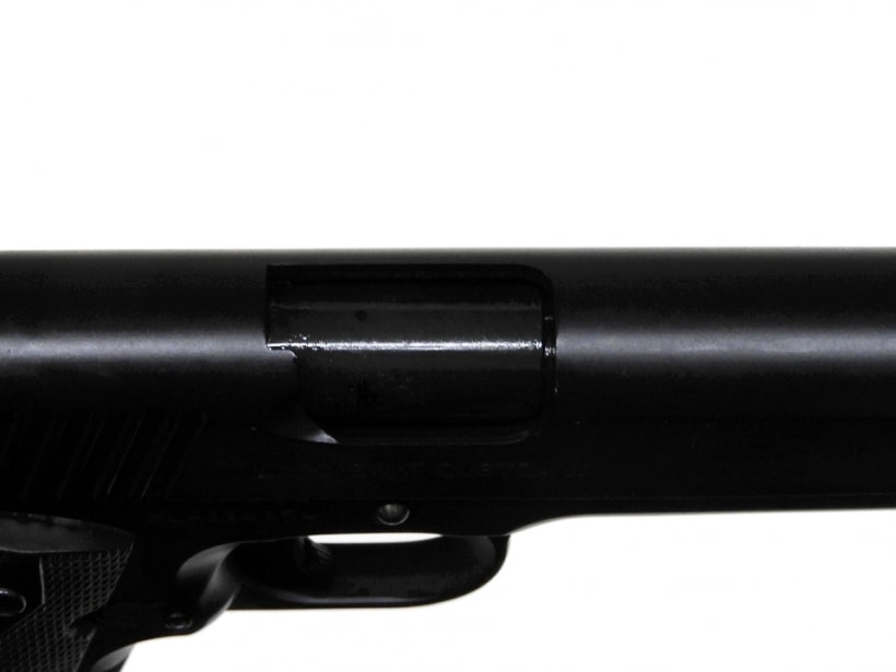 スライドの前後に設けられた幅の広いコッキングセレーションや、専用リアサイト、3ホールのリアルサイズトリガーやエクステンデッドサムセフティを完全再現。