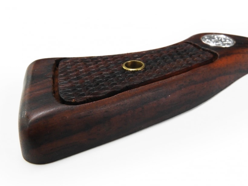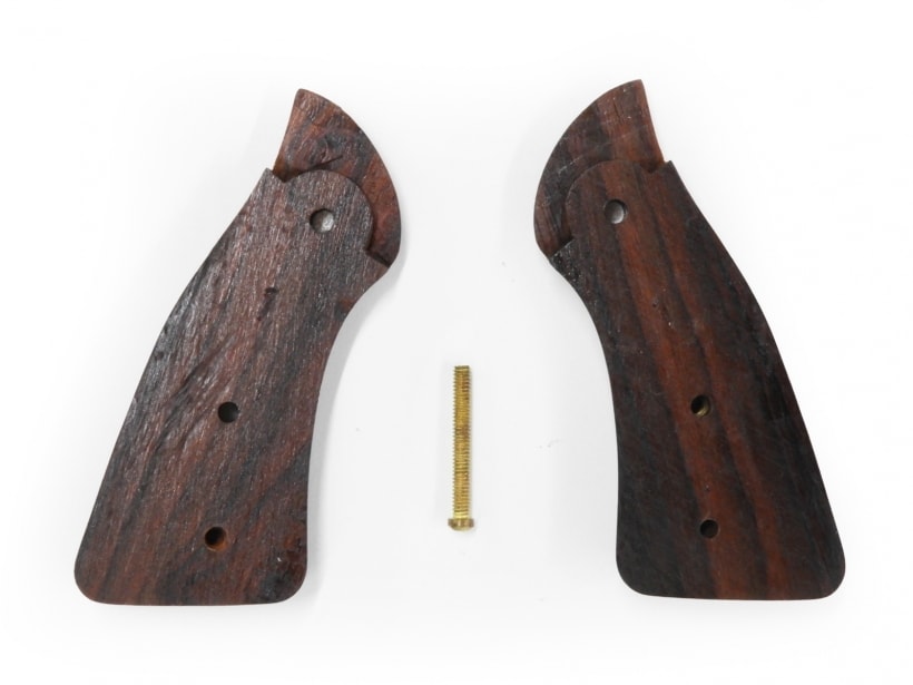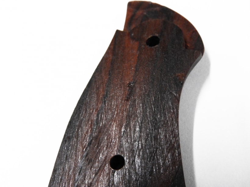 ローズウッドカラーの木製グリップパネル。チェッカー部分が平らになっているタイプです。モデルアップの少ない「Jフレームのスクエアバット」用。