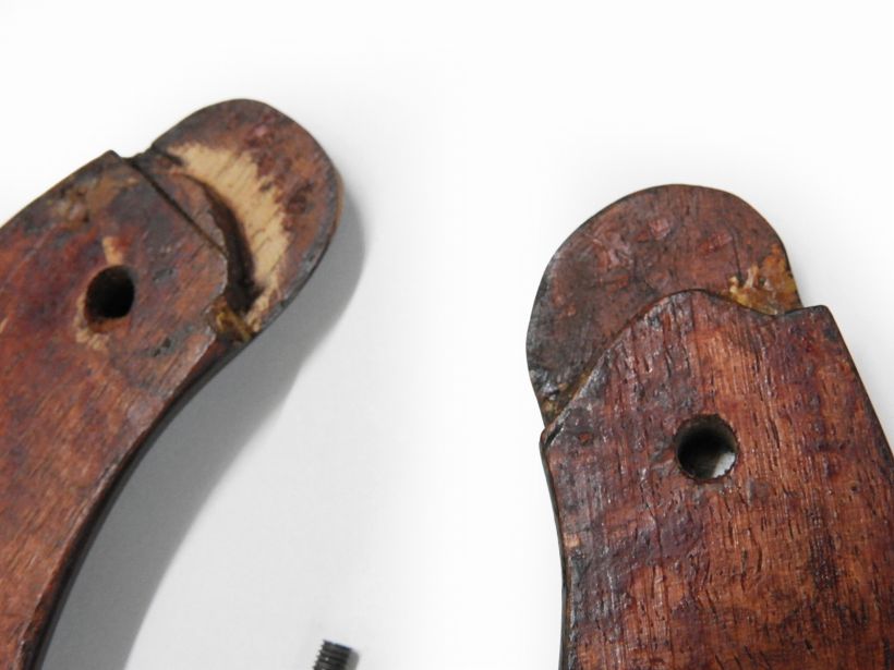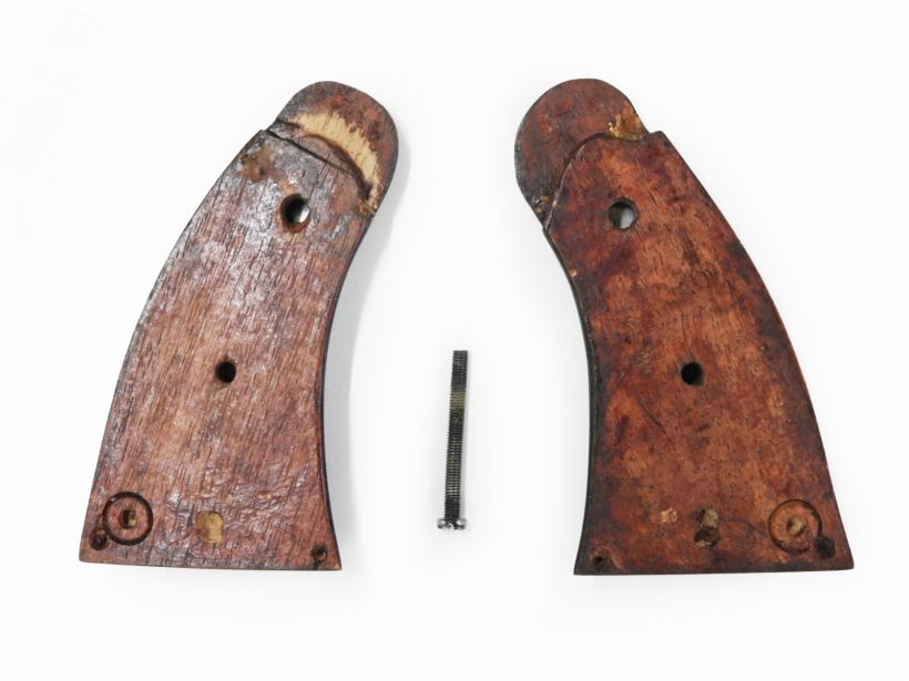 暗赤色の塗料が後から塗られたと思われる木製グリップパネル。裏面は加工跡あり。