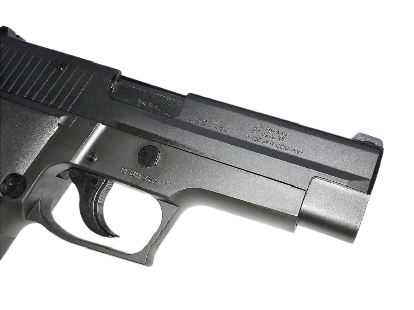 スイスのSIG社のP220シリーズの一つがこのP226。1983年に生まれた複列弾層の9mmオートで(1998年には40S&W、357SIGも)、デコッキング機構あり。優秀な銃であり、命中精度や信頼性の高さでは定評がある。価格は高く、グロック17やベレッタM92FS等と比べると100ドル以上高く、それもあってか米軍制式拳銃のトライアルでは負けたことも。また、トリガーが遠く、トリガープルが長い。銃身線が高いという欠点もある。しかしそれを補って余りある性能のために米空軍では制式採用された。この他、SWAT、FBI、各国軍隊、特殊部隊で使われている。プロが用いる拳銃である。2000年にはUS Navy Sealsの要請を受け、ステンレス削り出しのスライド(表面処理は黒もあり)つきが標準となった。このように細かな仕様変更が行われ、信頼性はさらに向上している。  フィクションの世界では『SPRIGGAN』(たかしげ宙&皆川亮二、小学館)の御神苗優、「X-File」セカンドシーズンのモルダー捜査官が使用している。