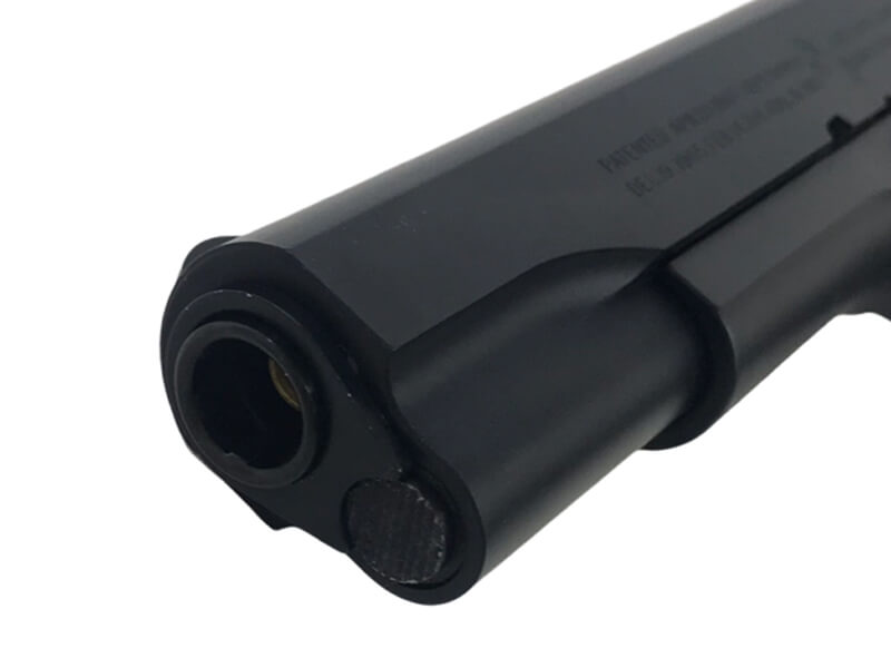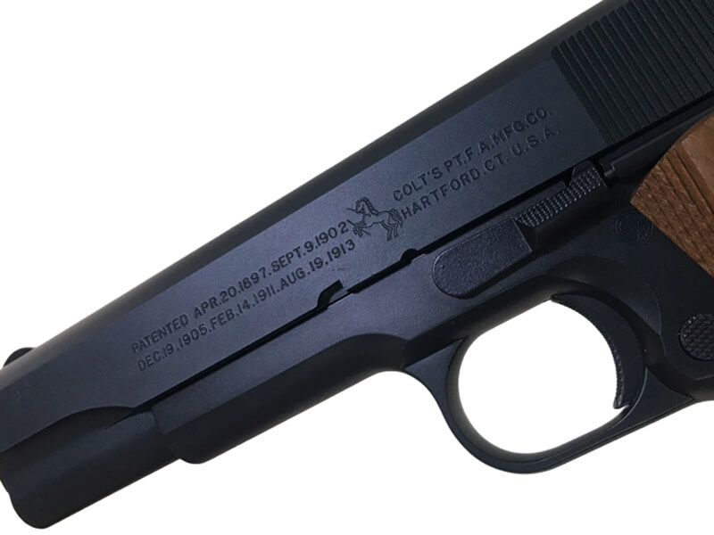 ガバメントの最初期モデルであるM1911。 その名の通り1911年に米軍に正式採用され、第1次大戦における実戦使用で得られた教訓から各部に小改良が施されました。この改良型M1911は1920年代後半に『M1911A1』として再度制式化されましたが、その際に過渡期モデルとして先行生産されたのが通称『トランジションモデル』と呼ばれる製品であり、M1911とM1911A1双方の特徴を併せ持つ事から現在のコレクター市場でも貴重なモデルとして珍重されています。 全体的な仕様はM1911A1そのものですが、刻印は「MODEL OF 1911」のままで、仕上げもパーカライジングではなくブルーフィニッシュを採用しているなど、後のモデルとの顕著な差異が見られます。