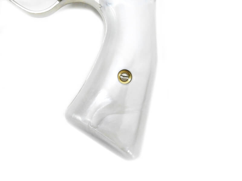 ニッケルフィニッシュされた本体はもちろんのこと、フェイクパールタイプのグリップや標準装備のハンマーをボブカットした特徴的な外観を再現しました。またJ・スコットタイプのリアルなグリップも別売予定しています。