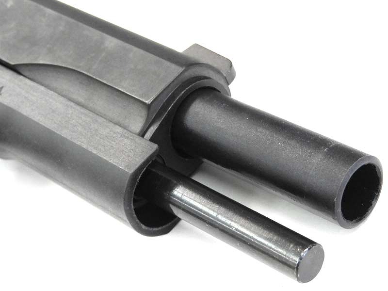 スライドを「分解ポジション」まで後退させ、スライドストップを約2ミリほど押し込みスライドストップを半抜けの状態にすることで、バレルとチャンバーを簡単に清掃可能。従来のようにスライド、フレーム、バレルをすべて分解しなくても簡易清掃が簡単に行える。