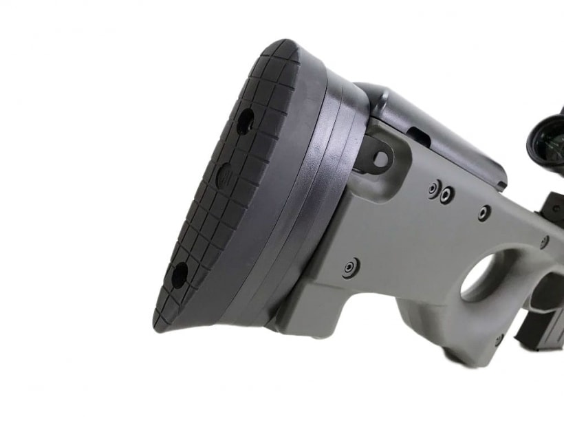 樹脂製のストック形状や、マガジン位置、そしてストック後部の調整可能なチークピースやバットプレートなど、見た目から使用感までL96のミリョクを最大限に味わえます。