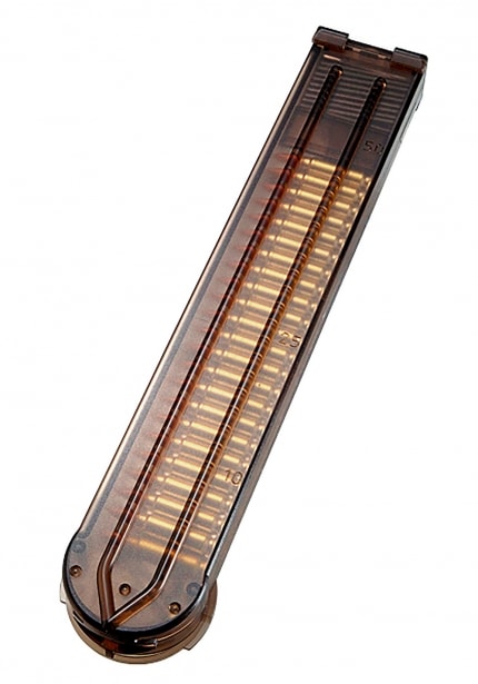 リポバッテリーに対応!プラスシステム搭載の新型P90。ヴァイオリンとよばれるユニークな形をしており、ストックと一体化したグリップ形状や本体上面に位置するマガジンなど、コンパクトにまとまったデザインを電動ガンで限りなくリアルにモデルアップ!!