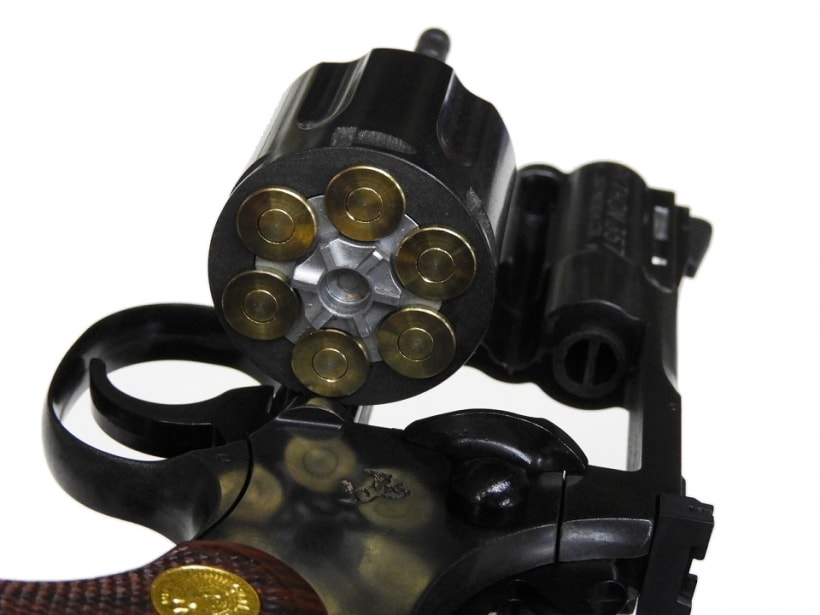 トリガー不調。引いた後自動で戻らず、指で軽く押し戻す必要があります。シリンダーもストッパーが機能しておらず、直接手で無限に回せてしまう状態です。外観は金属パーツの刻印周りに小さな赤錆でておりますが、おおむねは良好で観賞用等には問題ありません。グリップは比較的最近製造された物に交換されているようです。