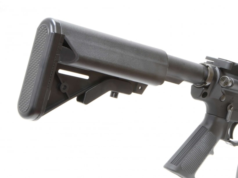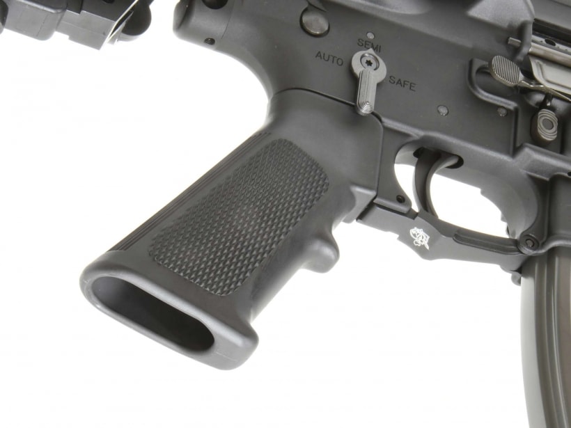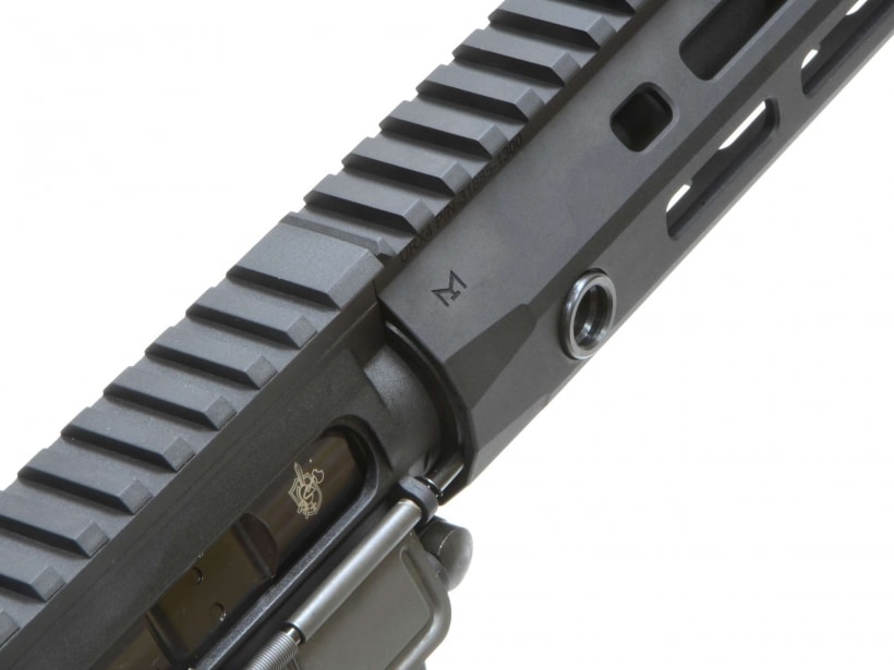 VFCと実銃メーカー"Knight's Armament Company" (KAC) 認可ライセンスによりSR-16を細部まで緻密に再現。アルミレシーバーはもちろんボルトキャリアに至るまで、KACの公式ライセンス品となっており、シリアルナンバータグもしっかり付属する。また、セレクター、マグキャッチ、ボルトリリースは利き手を選ばない両利き仕様(Ambidextrous)で、グリップもリアルサイズのA2グリップを装備。他にも45Dフリップアップサイト、QDCフラッシュハイダー(14mm逆ネジ)、ガスブロックにはHOP調整可能なクイックHOPアジャスト機構搭載を搭載しており、ゲームユースにもうれしい充実の仕上がりになっている。
