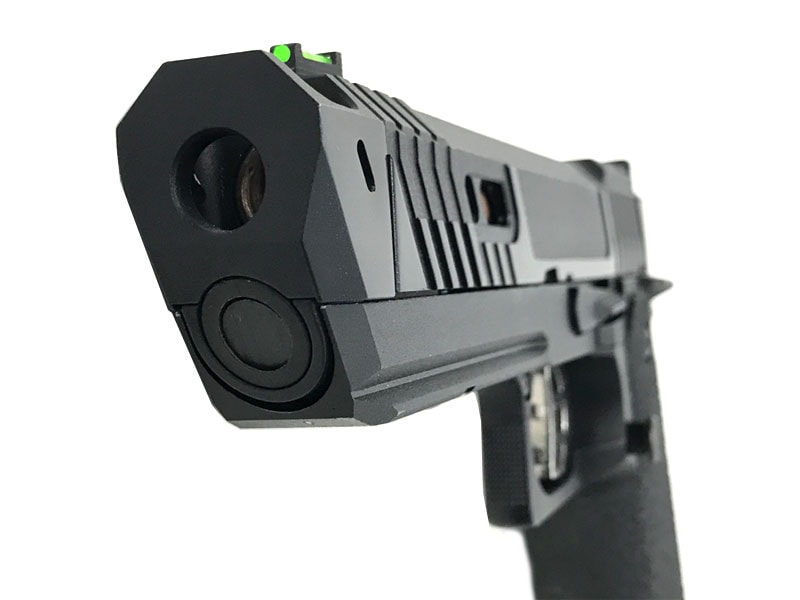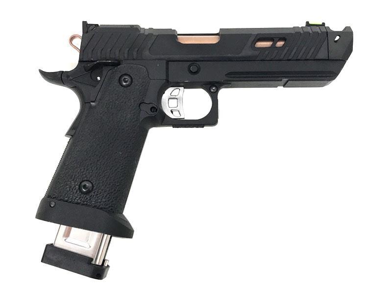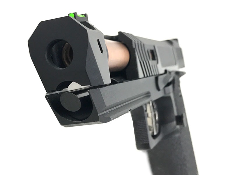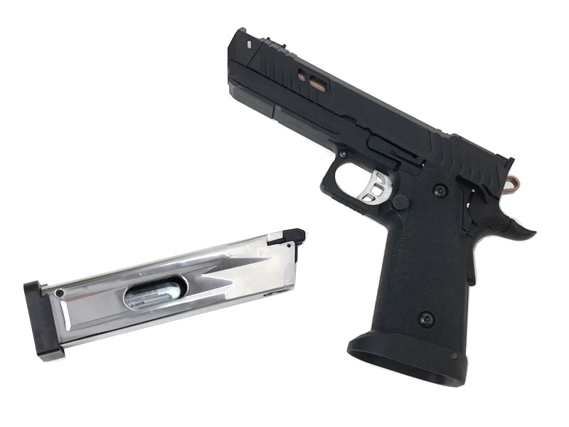 ハンドガンの場合は全体を金属性とする組み換え、エアソフトガンの場合は射出エネルギー0.98J以上にする改造を行うと銃刀法違反となります。HFC134a仕様のガスガンにCO2用マガジンを組み込む、スライドを金属製の物に差し替える等、簡易な改造でも罪に問われる可能性がございますので、絶対にお止めください。