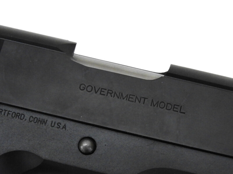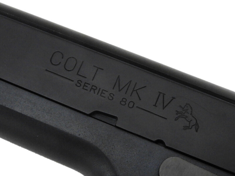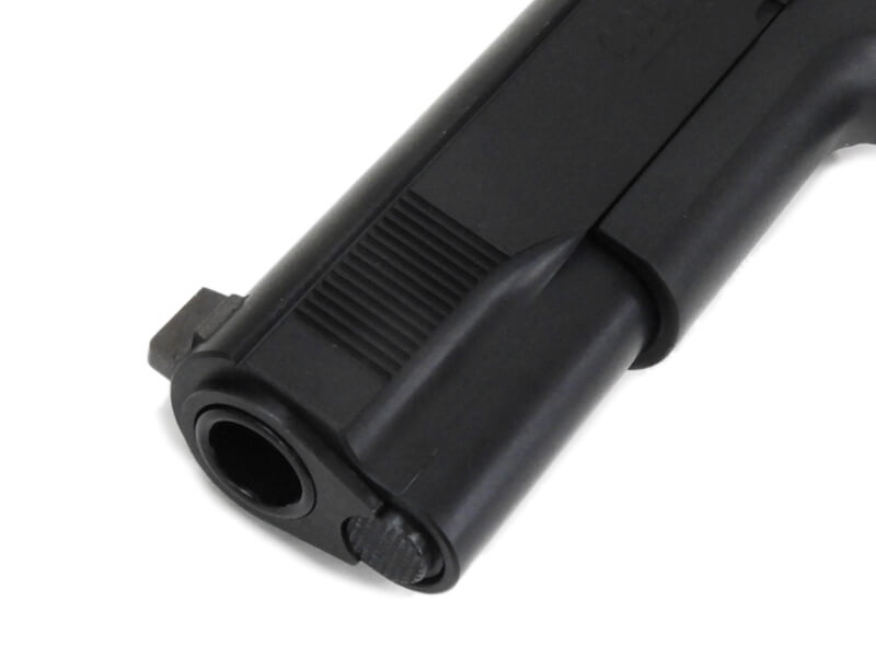 スパーハンマーはチェッカリング仕様またノバックタイプのリアサイトもしっかり大きなナイスサイズ。サムセフティは、機械加工で形状を整えた"ワイドサムセフティ"。サイドのラインがビシー!っと決まったスライド部分。コッキングセレーションや、サイト取付け用の溝も全部機械加工で再現。トリガーもリアルサイズ。加工で施されたフレームのリーフカットも、全体の雰囲気をビシッと引き締めている。