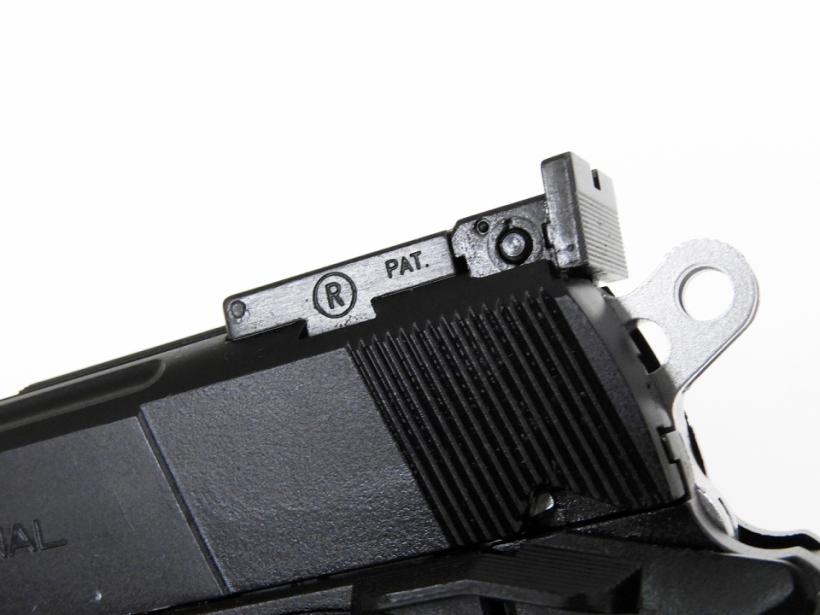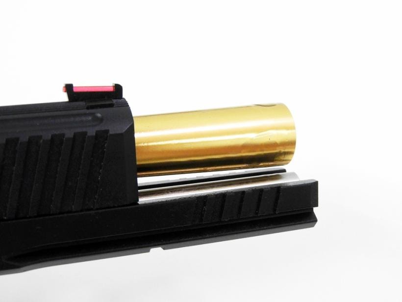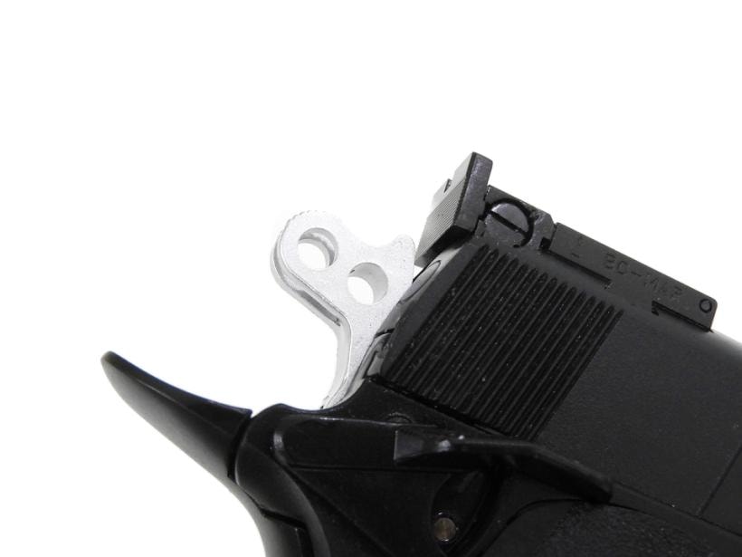 ヘビーウエイト製スライドに刻まれるマーキングは彫刻機にてシャープに再現されており、アルミ製コーンバレルと、ステンレス製ロングリコイルSPガイドロッドを装備することで、スムーズで安定したスライド作動を実現しています。レースガンでおなじみのフルアジャスタブル・ボーマーサイト。そのほか、独特の肉抜き加工が施されたカスタムハンマーや、エクステンディッド・アンビセフティを装備。