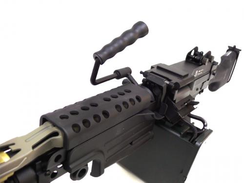 外観はフルメタルでTOP製のミニミにも負けない重厚な造り。詳細に比べるとメカ部分やHOPの性能は国内産の電動ガンに軍配が上がるが、このミニミの雰囲気を味わうには十分おすすめできる一品。SAW(分隊支援火器)の決定版。歩兵120人分の火力を持つといわれ、5.56の弾薬を使用するため、M16などのマガジンも使用できる。装填数2500発のBOXMAGAZINE付き。