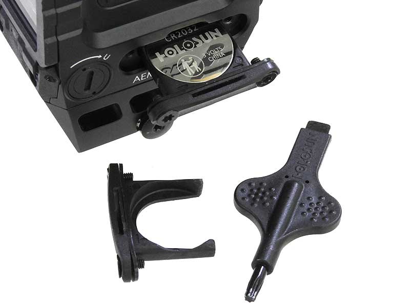 ガラス製フリップダウン レンズ カバー、65MOA 円内に高精度 2MOA ドットを備えた Holosun の MRS (マルチ レティクル システム)、ソーラー フェールセーフ、Shake Awake テクノロジー等数多くの機能をコンパクトに搭載。側面に取り付けられたバッテリー トレイにCR2032ボタン電池を入れるだけで簡単に使用可能。レッド スーパーLED搭載で 12 段階の強度設定が可能で、そのうち 4 段階はナイトビジョンとの互換性を持ち、最大 50,000 時間のバッテリー寿命を実現している。