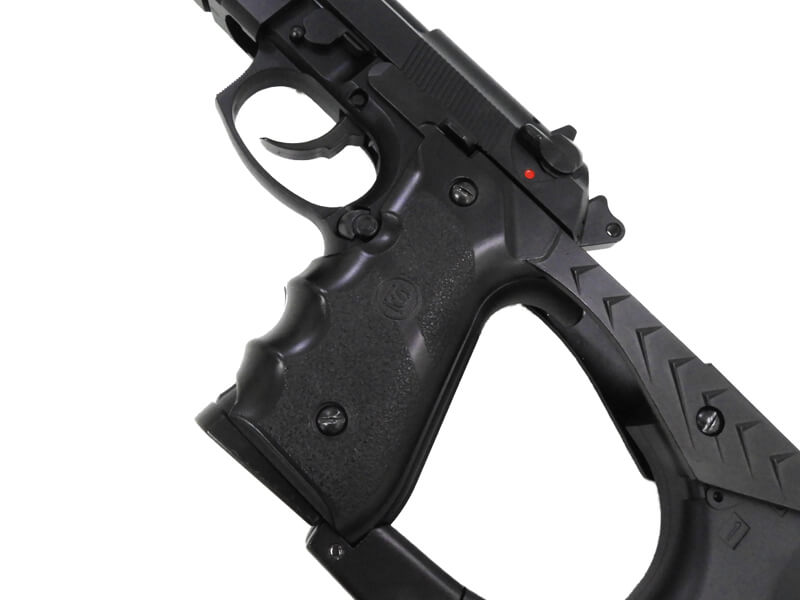 ベレッタ M92F をモデルに、金属製アンダーレールとサイレンサーを装着できるスレッデッドバレルを装備したM92F Tカスタムに、さらにグリップ一体型ストックを装備したカービンモデル。ストックがあるため、ライトやレーザーサイト等たくさんのデバイスを取り付けてもしっかりと安定して射撃することができる。