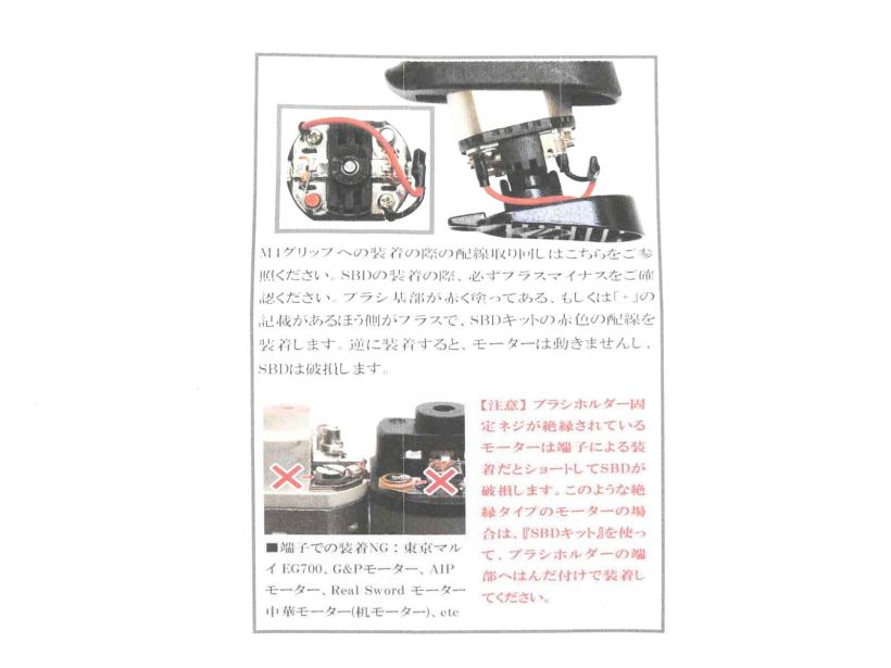 SBD(ショットキーバリアダイオード)をモーターに装着することによりモーターの逆起電流を抑制し、電動ガンのスイッチの摩耗を低減することが出来ます。