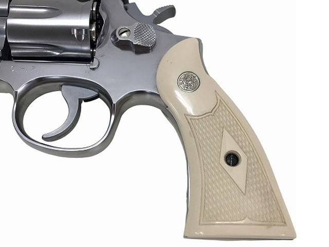 [タナカ] S&W M68 カリフォルニア ハイウェイ パトロール ファースト・デリバリー 6インチ 発火モデル ホワイトグリップ (中古) 製品詳細画像 キレイなメダリオン入、ダイヤチェッカーホワイトグリップです。