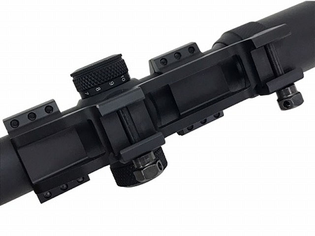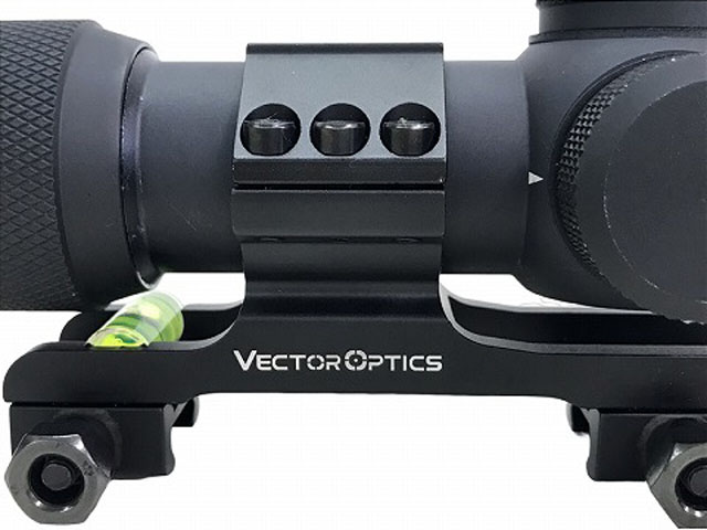実銃用のスペックを満たしながら、扱いやすさからエアガン界でも人気のメーカー、ベクターオプティクスのライフルスコープ。 水平器のついた同社製のワンピースマウント付属。