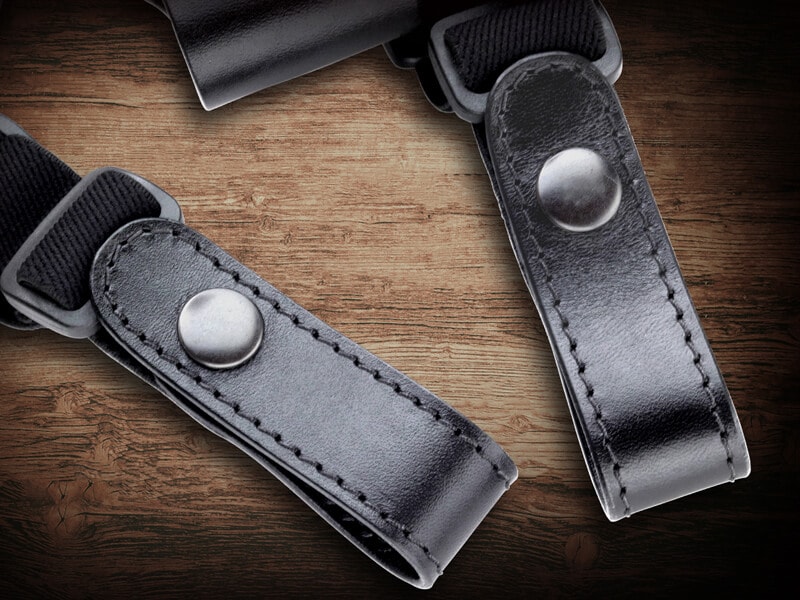 銃の後部を保持するストラップの裏側には、スナップボタンの金具がスライドを傷つけないように樹脂製のカバーが取り付けられた安心設計。