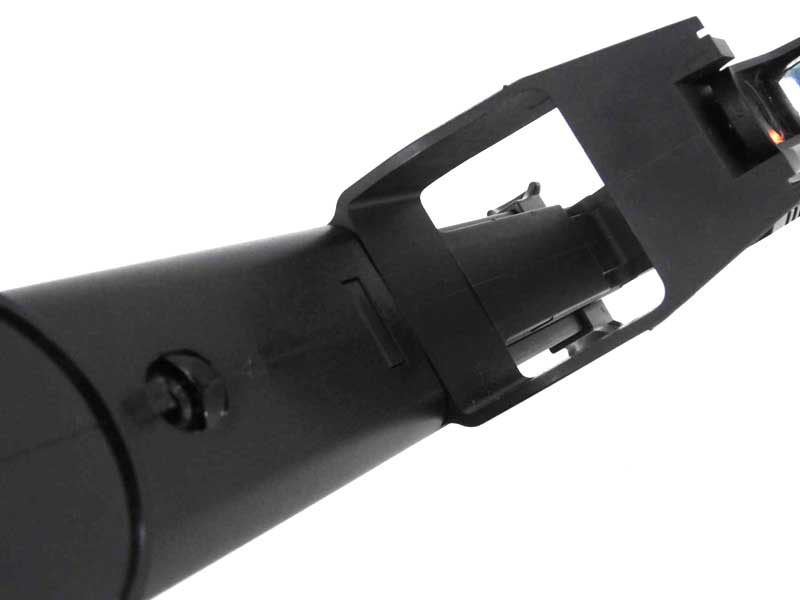 グリップ一体型のストックに覆われた機関部と、ドットサイトとユニット化したバレル、そしてマガジンの3つに分解可能。本物と同じテイクダウンを再現しました。
