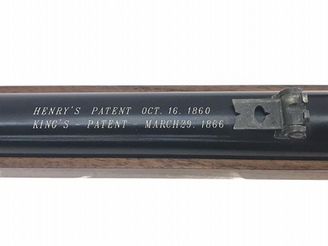 [HWS] ウィンチェスター M1866 イエローボーイ 金メッキ薄め (中古) 製品詳細画像 美しくブルーイングされたアルミアウターバレル上部の刻印。先代M1860の設計者B・タイラー・ヘンリーの名と、それに改良を施しパテントを取得したネルソン・キングの名が刻まれている。