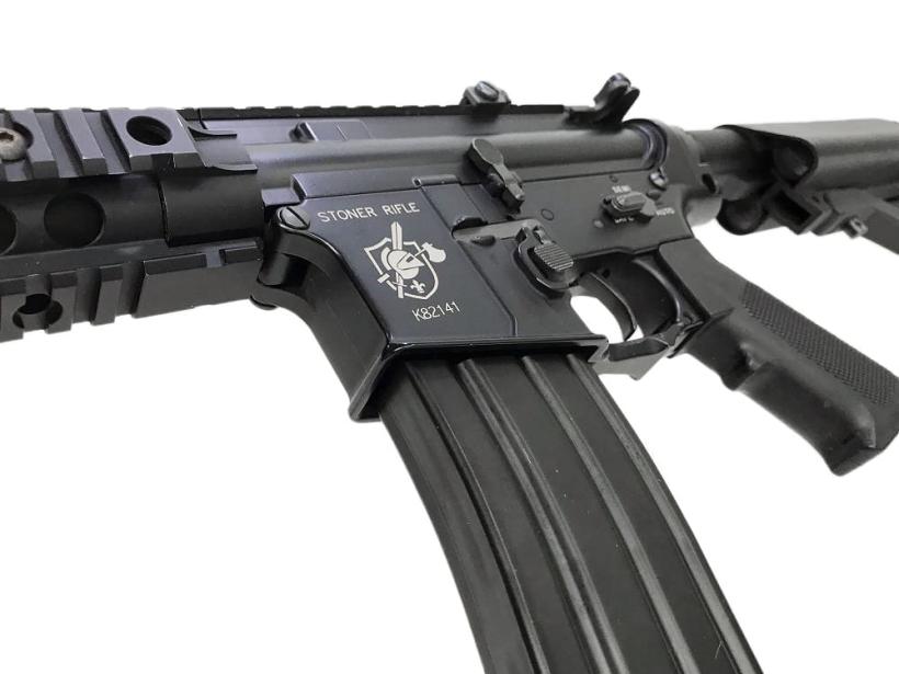 アメリカ軍特殊部隊用に様々な装備を開発してきたナイツ・アーマメント社のM16が、ストーナーズ・ライフル「SRシリーズ」。7.62mm×51弾を使用するナイツ社のM16・SR-25に対し、5.56mm×45弾を使用するSR-16は、コルト社のM4A1カービンに相当するモデル。素材の選定からパーツ精度までこだわりぬいて作られたSR-16は、コルト社の通常軍用モデルとは一線を画する仕上がりとなり、特殊部隊の精鋭達から尊敬と畏怖をこめて「ブラックナイツ(=黒騎士)」と呼ばれる。