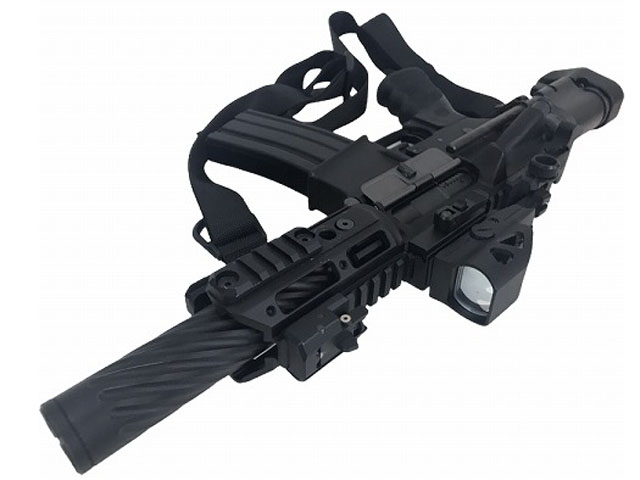 WE-Tech社がH&K HK416Cをベースに製造したカスタムガン。全体にコンパクトにまとめられており、デフォルトで装備されたサイレンサーが印象的です。レシーバーには45度ごとの各面にレールを装着することができます。