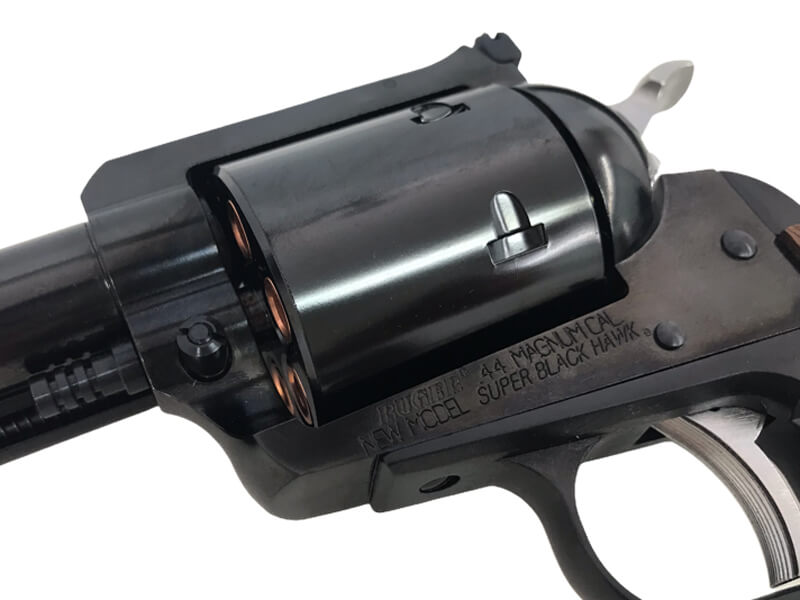 人気のスタームルガー社、44マグナム仕様のシングルアクションリボルバー スーパーブラックホーク!多くの要望に応えて大迫力の10.5インチシリーズ登場!! こちらは「木製グリップ」モデル「WディープブラックABS」の販売ページとなっています