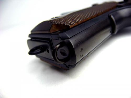 実銃同様スライドストップが大型になっており、指をかけやすくとても使いやすい。マガジンのランヤードリングはガス注入バルブがあるにもかかわらずアイデアでよく再現している。いかにもミリタリーモデルという感じに各パーツに刻印が入っているがこれらも全て再現しているし、独特の形状のパーツ類もわざわざ専用金型を用意したというくらい、手間と情熱がかけられている。