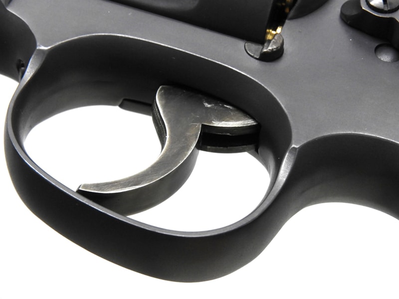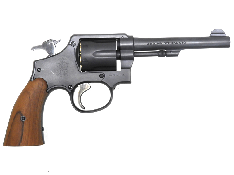<実銃はこんな銃> スミス&ウェッソン社のライバル、コルト社が発表したスイングアウト式のリボルバー拳銃は、弾丸の素早い争点と強固なフレームを両立させた革新的な装填システムであった。S&W社も1896年にスイングアウト式のリボルバー拳銃を発表する。それが「ハンドエジェクター」である。この最初期モデルはコルトに数年遅れたこともあり、あまり良い評判を得られなかったが、後に名器「ミリタリー&ポリス(M10)」を生み出す土台となった。