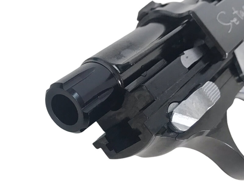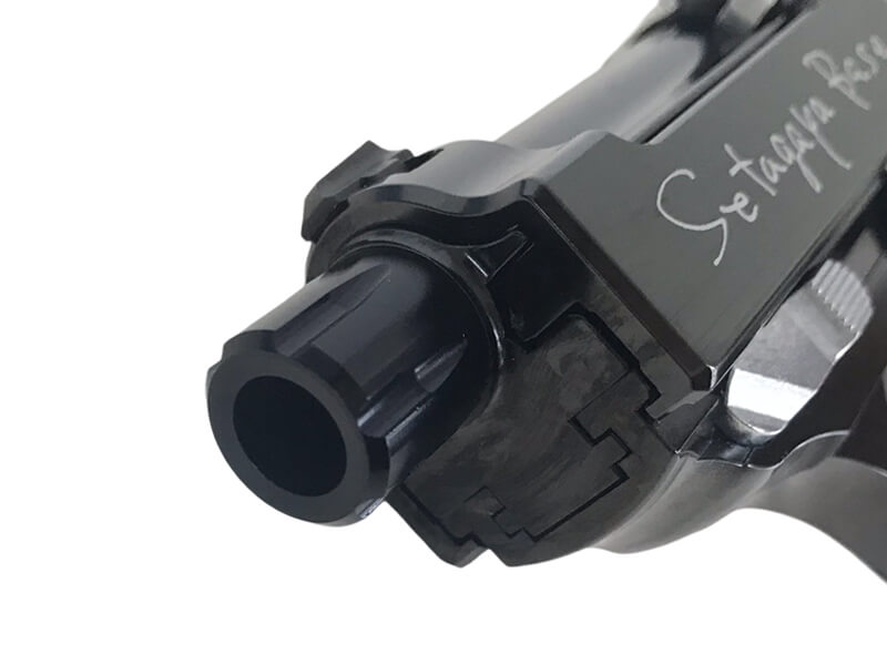 スライド前方に伸びるバレルをギリギリまで切り詰めて、ベリーショートバレルにカスタム、そして6スリット形状のオリジナルマズルを装着しました。