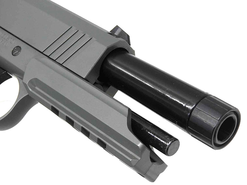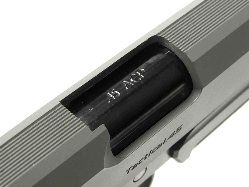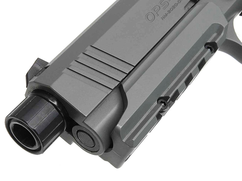チャンバー刻印は「.45ACP」となっており、14mm正ネジのアタッチメントに対応。スチール製スレッドカバー付き。