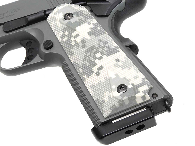 :BDUなどに使用されているACU(Army Combat Uniform)パターンを施した、ダイヤモンドチェッカータイプのグリップを装備しています。