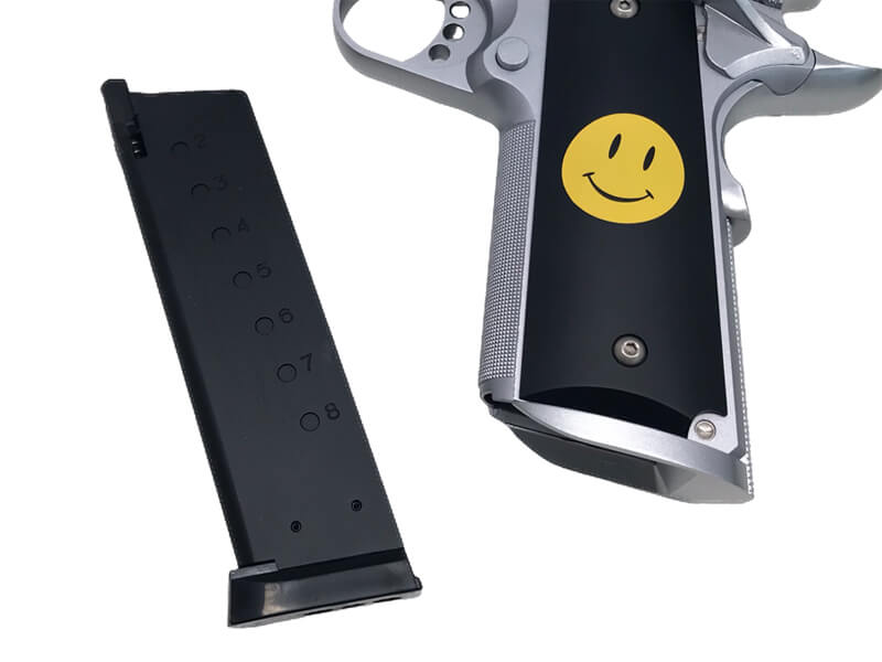 ハンドガンの場合は全体を金属性とする組み換え、エアソフトガンの場合は射出エネルギー0.98J以上にする改造を行うと銃刀法違反となります。HFC134a仕様のガスガンにCO2用マガジンを組み込む、スライドを金属製の物に差し替える等、簡易な改造でも罪に問われる可能性がございますので、絶対にお止めください。
