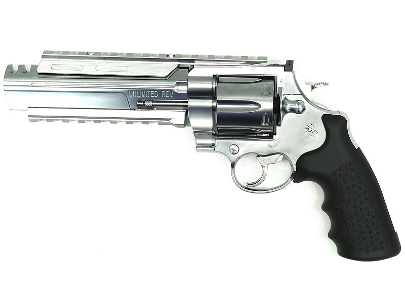 コルト社最大級のリボルバー、アナコンダ44マグナムをベースに近代的な20mmレイルを備えた重量約940gの怪物ガスリボルバー。HOGUEグリップ仕様。シルバーABSモデル。
