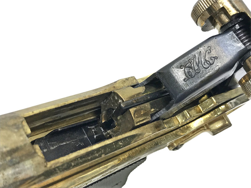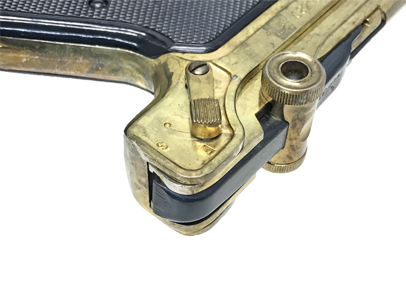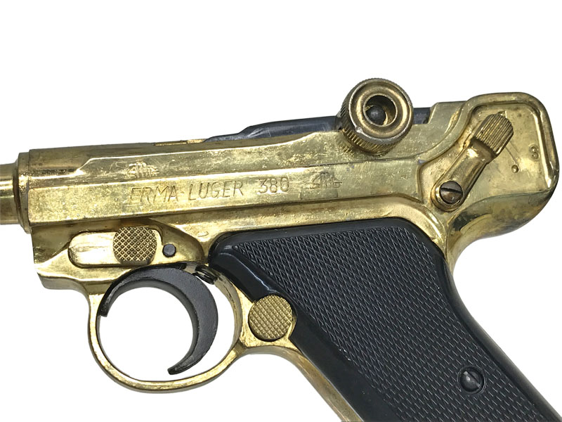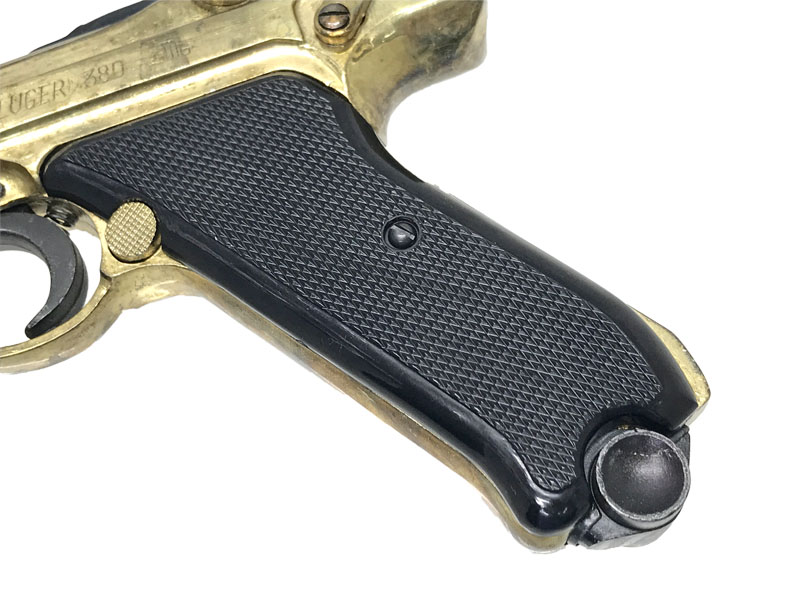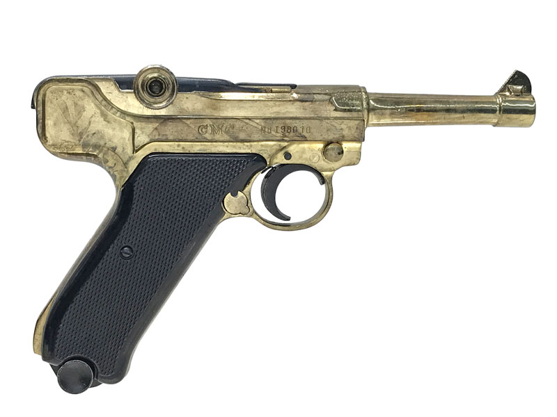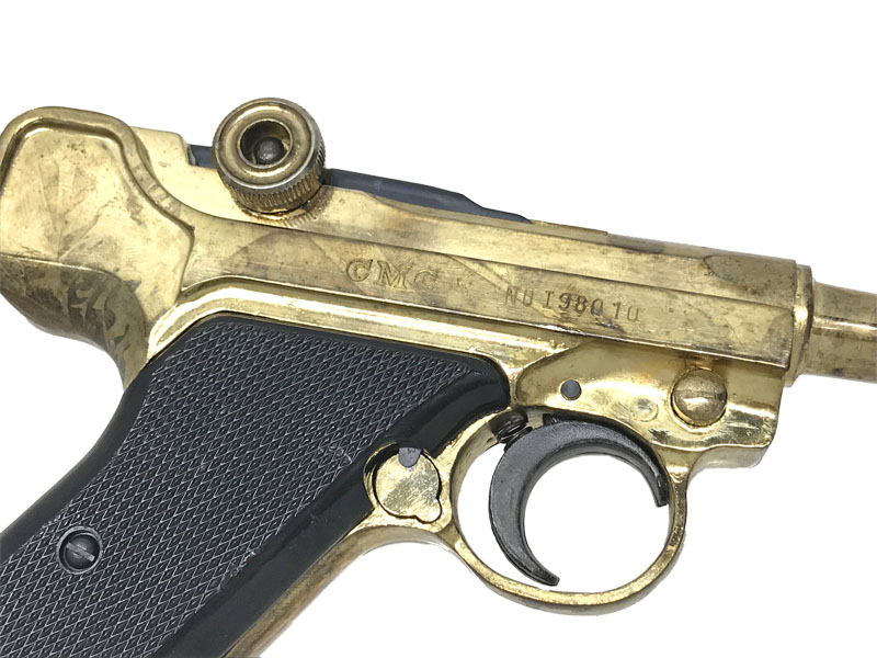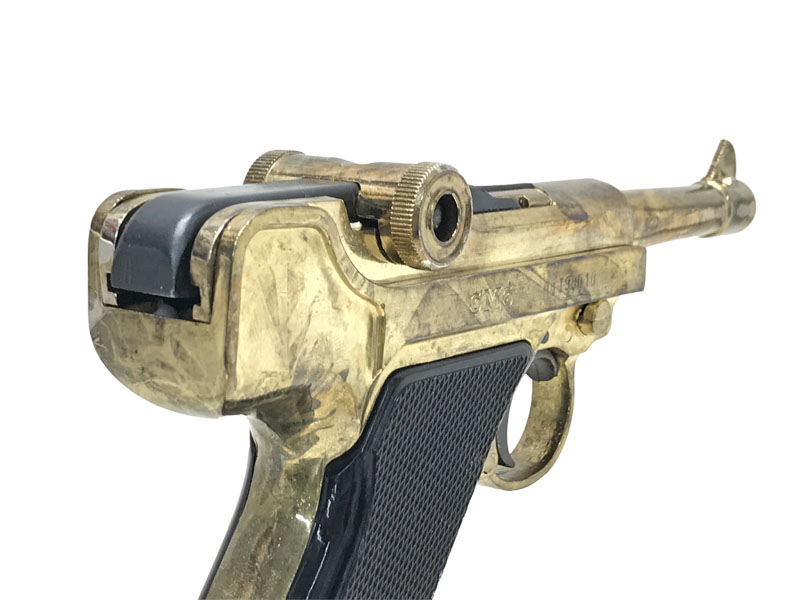 P08のようなトグルアクション。グリップは木製風塗装の樹脂製となります。かなり金メッキが薄い商品です。
