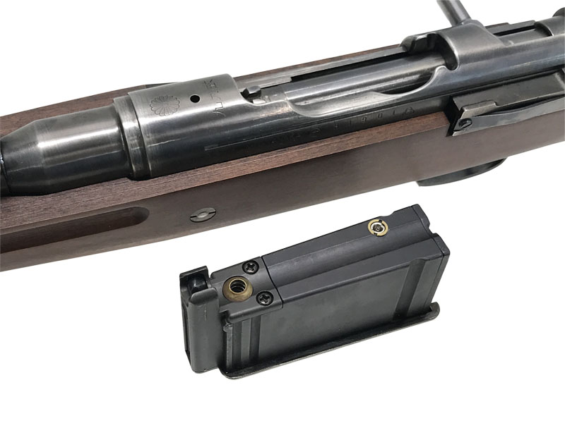 日本陸軍が1939年に制式採用した小銃。リアルなボルトアクション、トリガーフィーリング、実物に則した貼り合わせ構造のストック。機関部、銃身などは亜鉛合金、鉄が使われ、さらに特殊メッキで使い古した鋼鉄を再現した贅沢尽くしとなっている。