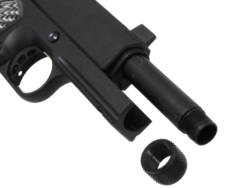 ハンドガンの場合は全体を金属性とする組み換え、エアソフトガンの場合は射出エネルギー0.98J以上にする改造を行うと銃刀法違反となります。HFC134a仕様のガスガンにCO2用マガジンを組み込む、スライドを金属製の物に差し替える等、簡易な改造でも罪に問われる可能性がございますので、絶対にお止めください。