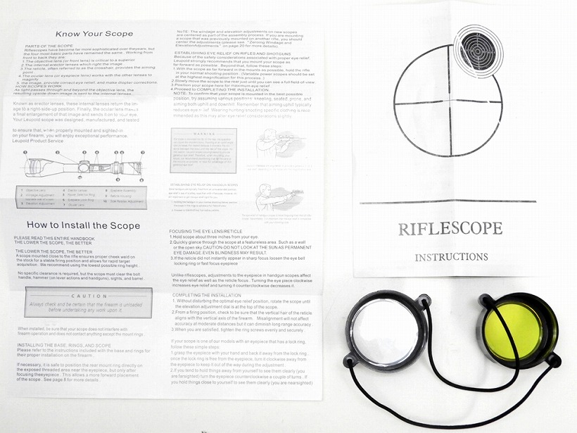 [G&P] M1タイプ イルミネートスコープ 3.5-10×40 ロング 3倍~ Φ30mm イルミネーション サンドカラー (中古) 製品詳細画像6 付属品の説明書とレンズキャップです。説明書は英語のみです。