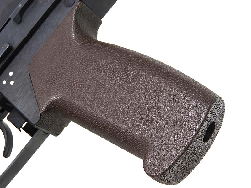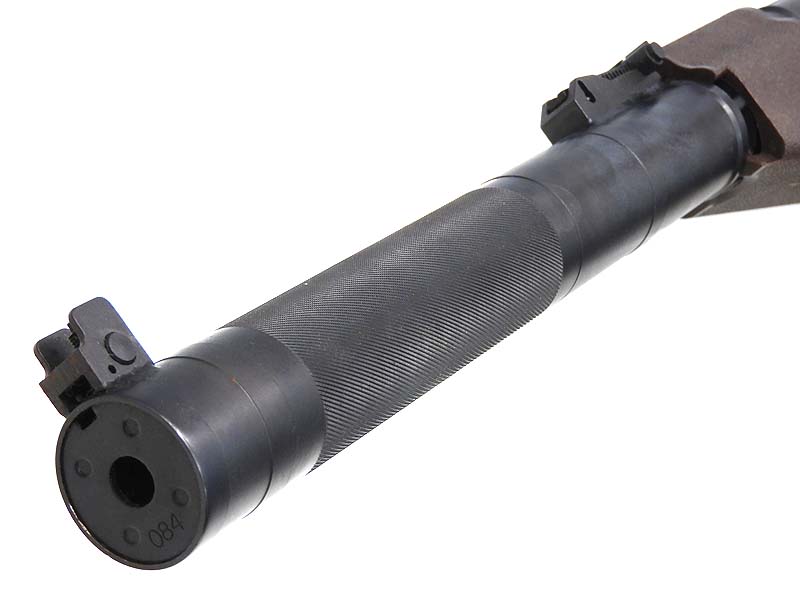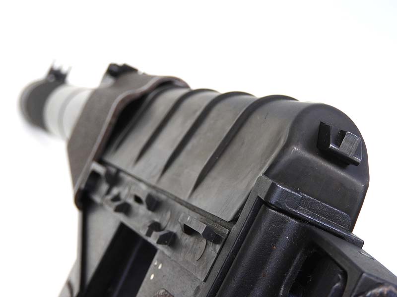 9x39mmの亜音速弾を使用する例のあれです。スチールのプレートを何重にも重ねたロアレシーバにプレス加工で製造されたダストカバーで剛性抜群。サプレッサーも相当な重量になっています。バッテリーを入れるサプレッサーとセレクターが非常に硬いので、指をケガしないよう手袋をつけて使用するのがオススメです!
