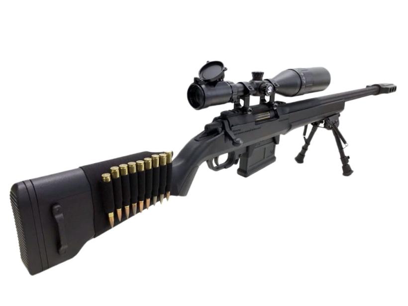 3-9×40可変倍率イルミネートスコープ、バイポッド、純正大型ハイダーを装着した外装カスタム品。