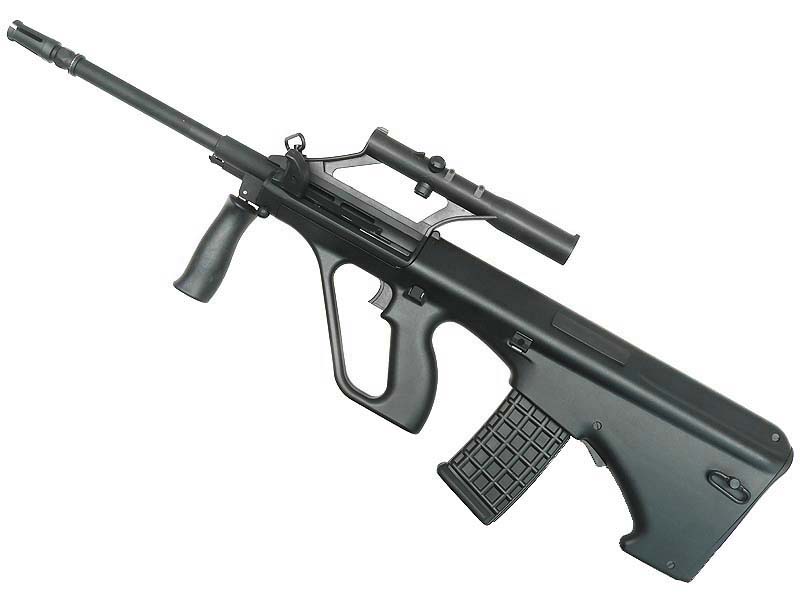 オーストリアのステアー社が開発したブルパップ式突撃銃。AUG(アウグ、オウグ)はドイツ語で「Armee Universal Gewehr:陸軍汎用小銃」の略。 人間工学を考慮したユニークなデザインからは想像できないほど命中精度が良好で、ブルパップ式で取り回しも良く、全長に反するバレル長を確保できている。さらにフレームにプラスチックを採用したため軽量であり、フレームと一体化したスコープマウントは、他の銃にありがちな脆弱さが無く固定が容易である。マガジンも同様にプラスチック製で、かつ半透明の成型としたため、レシーバーに装填したまま外から残弾確認が可能となっている。 ユニット化された各部品は分解し易く整備面において優れている上、容易かつ迅速に交換する事が可能で、排莢口を左右にスイッチしたり、組換えにより異なる種別の銃火器として使用することもできる。バレルとボルト機構を9mmPara用に交換すれば短機関銃に、621mm長のヘビーバレルとバイポッドを取り付ければ、分隊支援火器である「HBAR」となる。また、フォアグリップを取り外せばM203擲弾発射器の装着も可能となる。 難点はセミ/フルの切り替えで、一般的なセレクターが無く、トリガーの絞り具合で変化する(軽く引けばセミ、深く引けばフル)。使う兵士の心理状態を考慮した設計なのだろうが、他の銃と勝手が違うので、転換訓練には多少の馴れが必要となる。