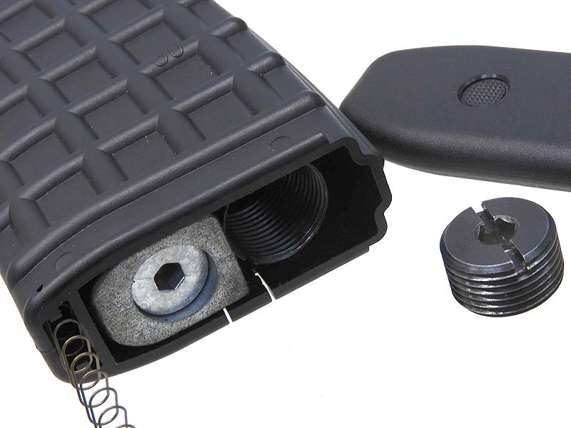 マガジン底面の蓋はスライドさせて外す仕様。スプリングが飛び出してくるので注意。
